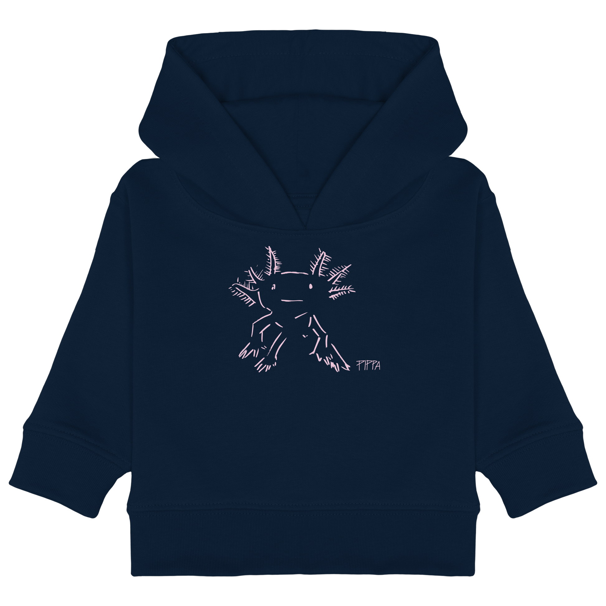 Dieser Backprint aus meiner Fauna-Serie zeigt das Axolotl, ein außergewöhnliches Amphibium aus Mexikos Süßwasser. Es behält sein Larvenstadium ein Leben lang – mit Kiemen, Gliedmaßen und sogar Teilen von Herz und Gehirn, die es nachbilden kann – eine Fähigkeit, die es einzigartig macht. In der Natur ist es leider vom Aussterben bedroht. Ein Wesen, das nie erwachsen wird – frisch, minimalistisch und modern gedruckt, ein dezenter Hingucker auf deinem Rücken.